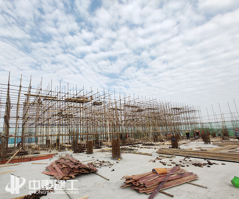 項(xiàng)目于2020年7月25日開工,經(jīng)過前期的不懈努力,在烈日炎炎的環(huán)境下,順利完成場地平整、土方開挖、基礎(chǔ)施工。2020年9、10月間,面對首層層高7.5米和二層層高超過8米的不利條件下,中泰建工嚴(yán)格按照經(jīng)專家論證通過的高大支模方案進(jìn)行模板施工,認(rèn)真檢查支撐體系。確保達(dá)到施工的安全情況下,順利完成模架支撐體系搭設(shè)。于2020年11月16日順利完成結(jié)構(gòu)封頂。