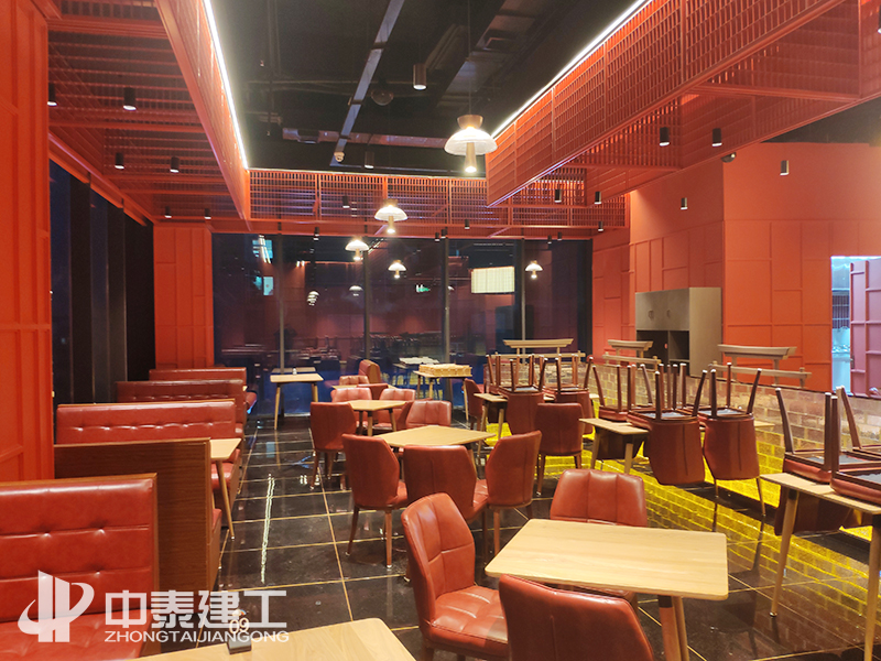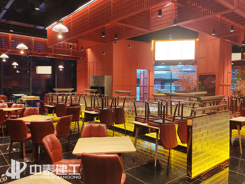 工程概況:本工程包括給排水、電氣、木門及玻璃門安裝、玻璃磚隔斷墻、石材干掛及墻地貼磚、吊頂、室內(nèi)乳膠漆、不銹鋼裝飾、景觀花藝等圖紙范圍內(nèi)的內(nèi)容。蒙度餐廳以紅色系、金黃色系為主,頂部為多層云狀吊頂,邊緣做暗藏?zé)魩Р?;墻面以云狀凸出造型為主,配以線性燈裝飾;地面與餐位鑲嵌擺放景觀,使整體效果即紅火又自然。湘菜館主要以紅色鐵藝造型及金色不銹鋼為主,配以景觀花藝、玻璃磚隔斷及燈光照明,使就餐環(huán)境優(yōu)美自然。